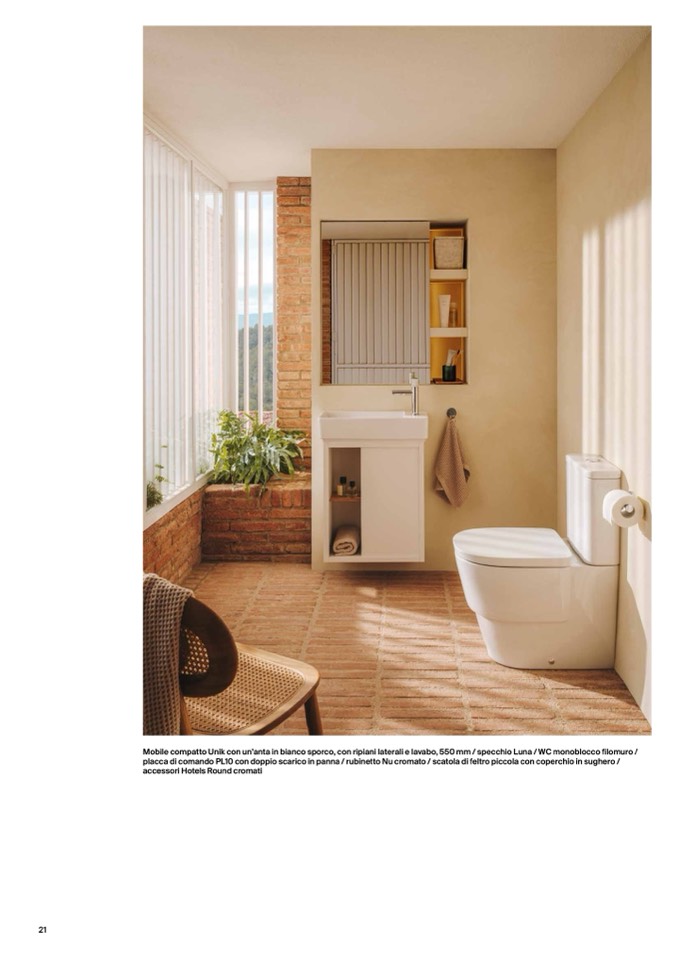 Mobile compatto Unik con un’anta in bianco sporco, con ripiani laterali e lavabo, 550 mm / specchio Luna / WC monoblocco filomuro /