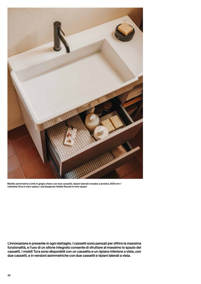 cassetti. I mobili Tura sono disponibili con un cassetto e un ripiano inferiore a vista, con