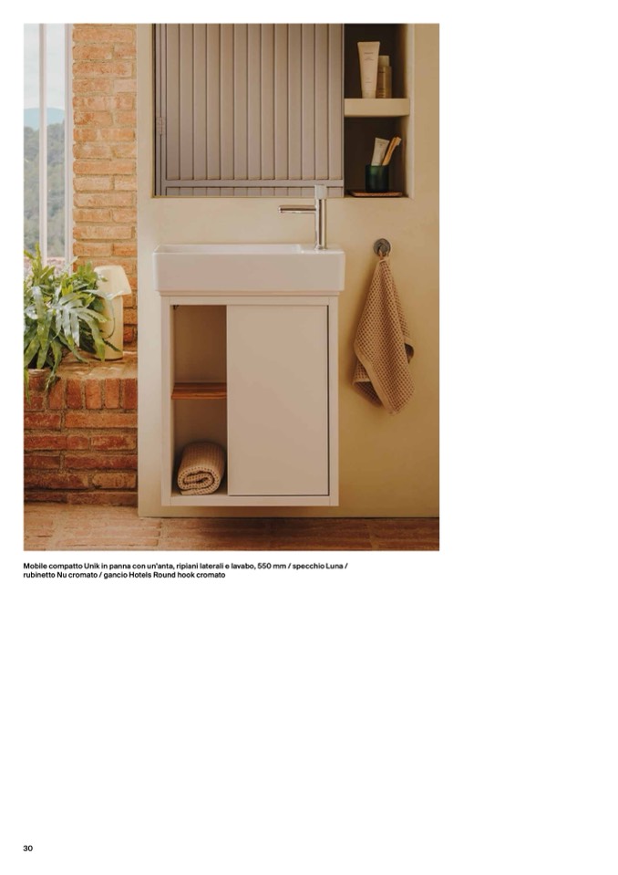 Mobile compatto Unik in panna con un’anta, ripiani laterali e lavabo, 550 mm / specchio Luna /