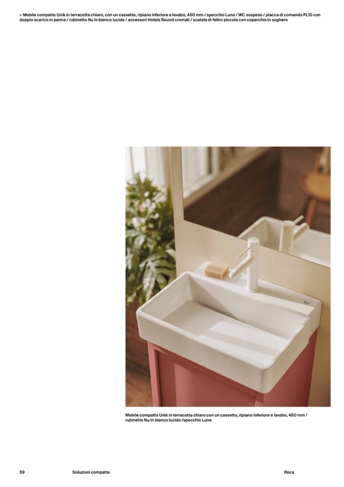 Mobile compatto Unik in terracotta chiaro, con un cassetto, ripiano inferiore e lavabo, 450 mm / specchio Luna / WC sospeso / placca di comando PL10 con