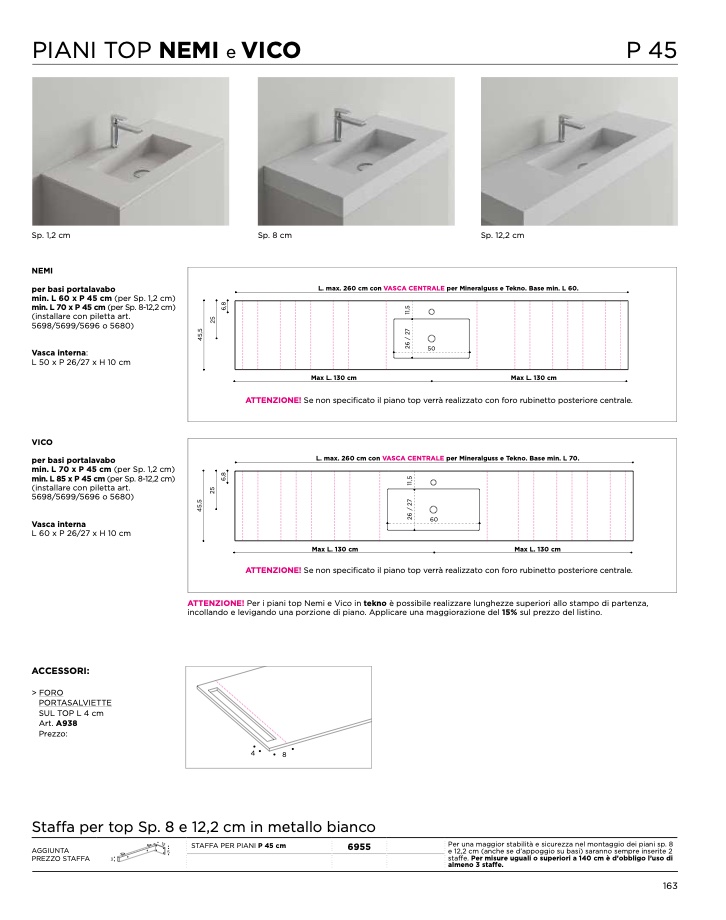 ATTENZIONE! Per i piani top Nemi e Vico in tekno è possibile realizzare lunghezze superiori allo stampo di partenza,