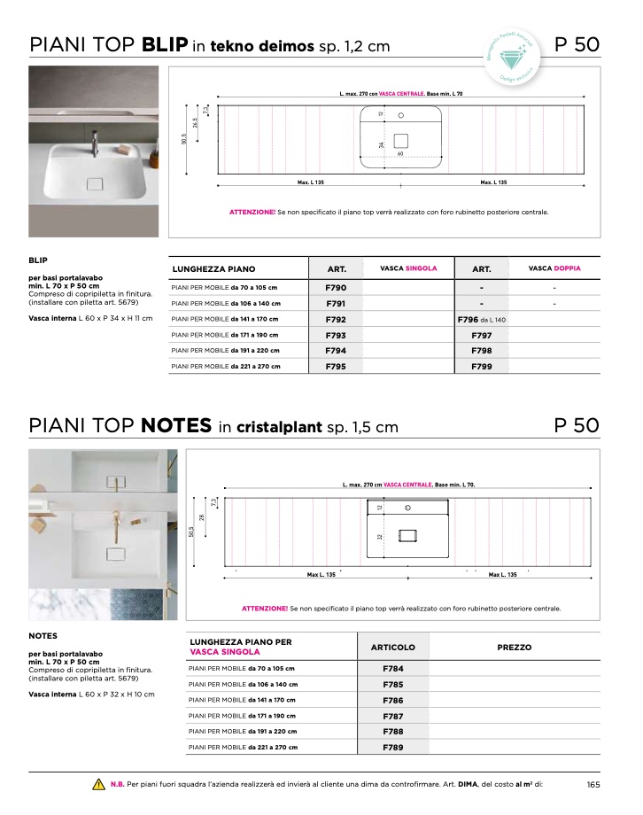 ATTENZIONE! Se non specificato il piano top verrà realizzato con foro rubinetto posteriore centrale.
