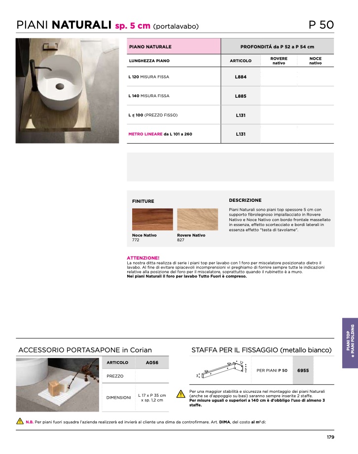 Nei piani Naturali il foro per lavabo Tutto Fuori è compreso.