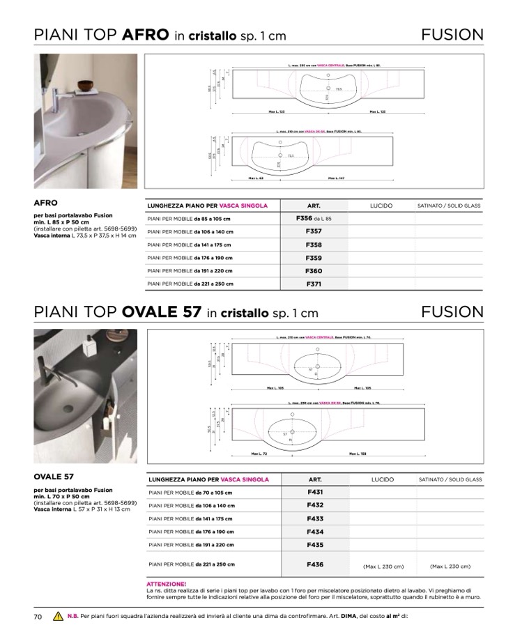 L. max. 250 cm con VASCA CENTRALE. Base FUSION min. L 85.