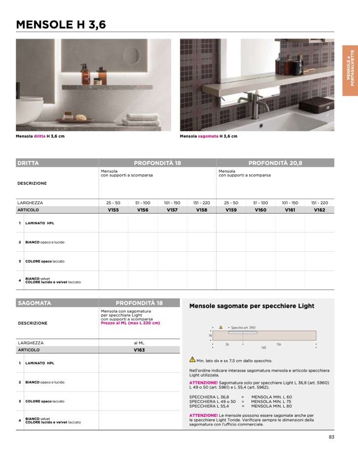 Nell’ordine indicare interasse sagomatura mensola e articolo specchiera