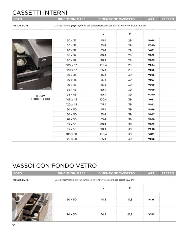 Cassetti interni grigi sagomati per basi portalavabo con cassettone H 49, 61,2 o 73,4 cm