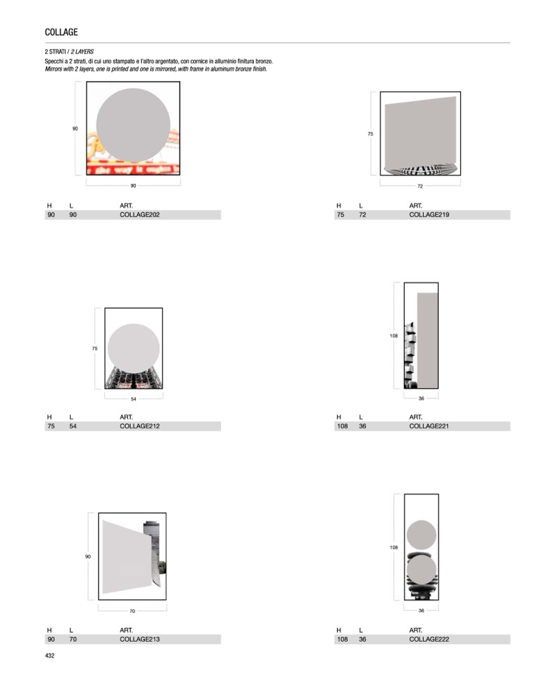 Specchi a 2 strati, di cui uno stampato e l’altro argentato, con cornice in alluminio finitura bronzo.