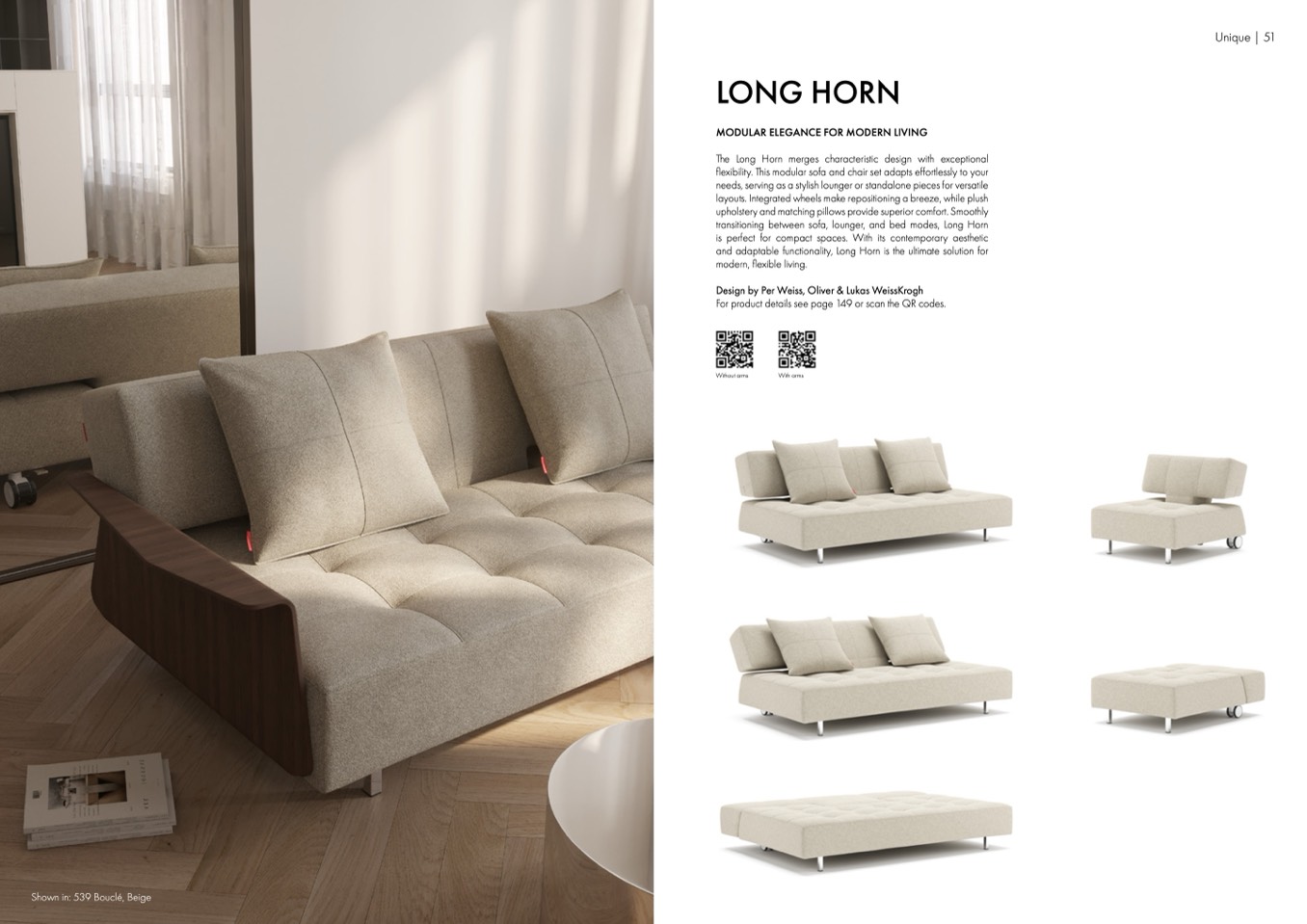 transitioning between sofa, lounger, and bed modes, Long Horn