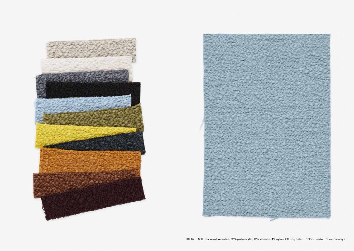 HELIA 47% new wool, worsted, 32% polyacrylic, 15% viscose, 4% nylon, 2% polyester 152 cm wide 11 colourways