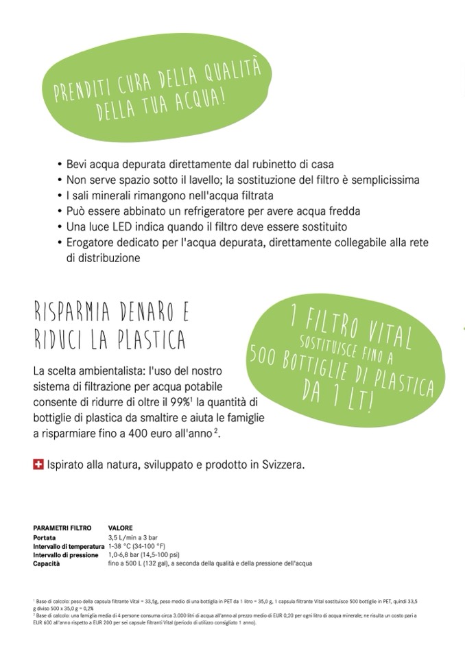 EUR 600 all'anno rispetto a EUR 200 per sei capsule filtranti Vital (periodo di utilizzo consigliato 1 anno).