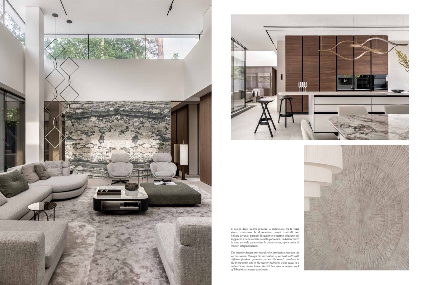 finiture diverse: pannelli in quarzite e marmo spiccano nel