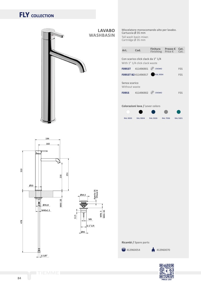 Miscelatore monocomando alto per lavabo.