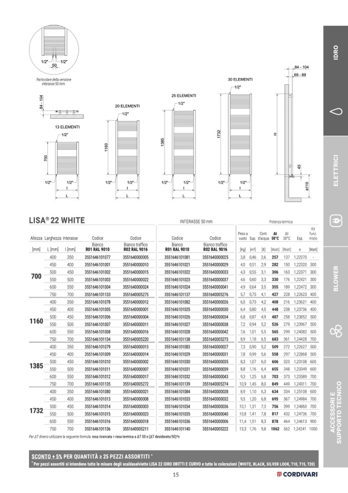 Per pezzi assortiti si intendono tutte le misure degli scaldasalviette LISA 22 IDRO DRITTI E CURVO e tutte le colorazioni (WHITE, BLACK, SILVER LOOK, T10, T15, T20)