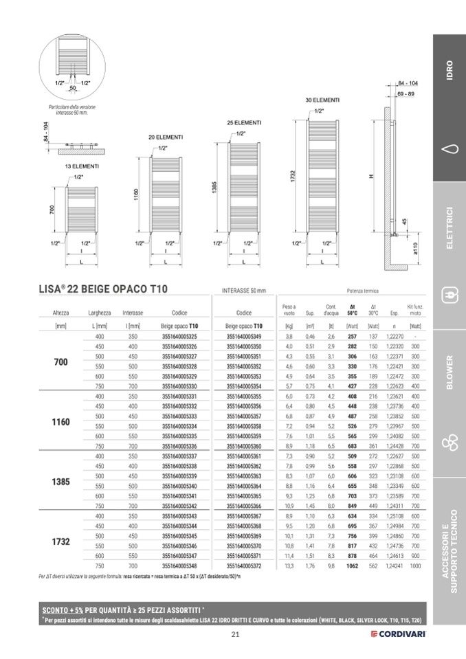Per pezzi assortiti si intendono tutte le misure degli scaldasalviette LISA 22 IDRO DRITTI E CURVO e tutte le colorazioni (WHITE, BLACK, SILVER LOOK, T10, T15, T20)