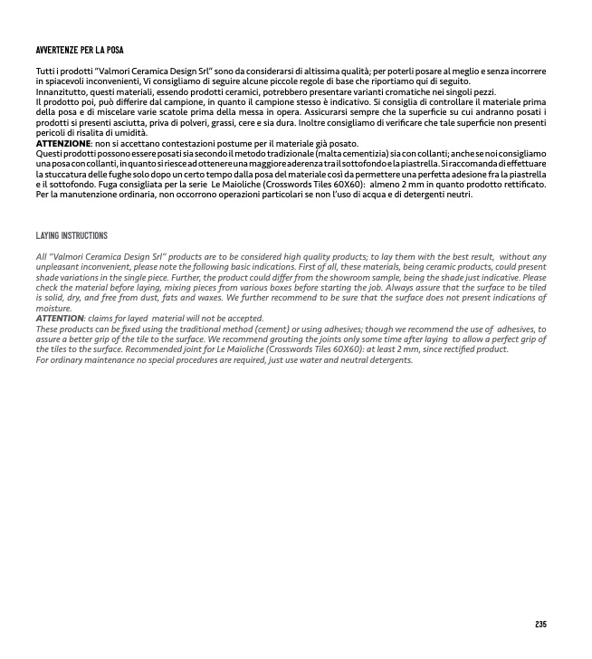 All “Valmori Ceramica Design Srl” products are to be considered high quality products; to lay them with the best result, without any