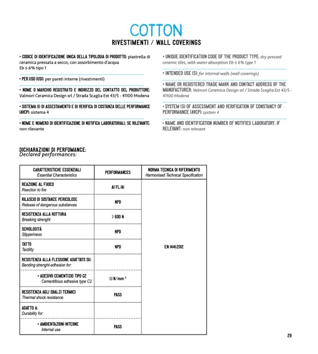• CODICE DI IDENTIFICAZIONE UNICA DELLA TIPOLOGIA DI PRODOTTO: piastrella di