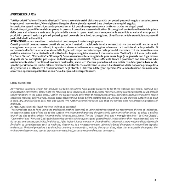 All “Valmori Ceramica Design Srl” products are to be considered high quality products; to lay them with the best result, without any
