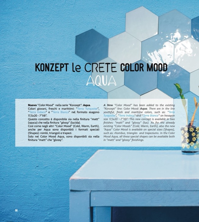 Turquoise”, “Terra Indaco” and “Terra Bianca” on hexagon