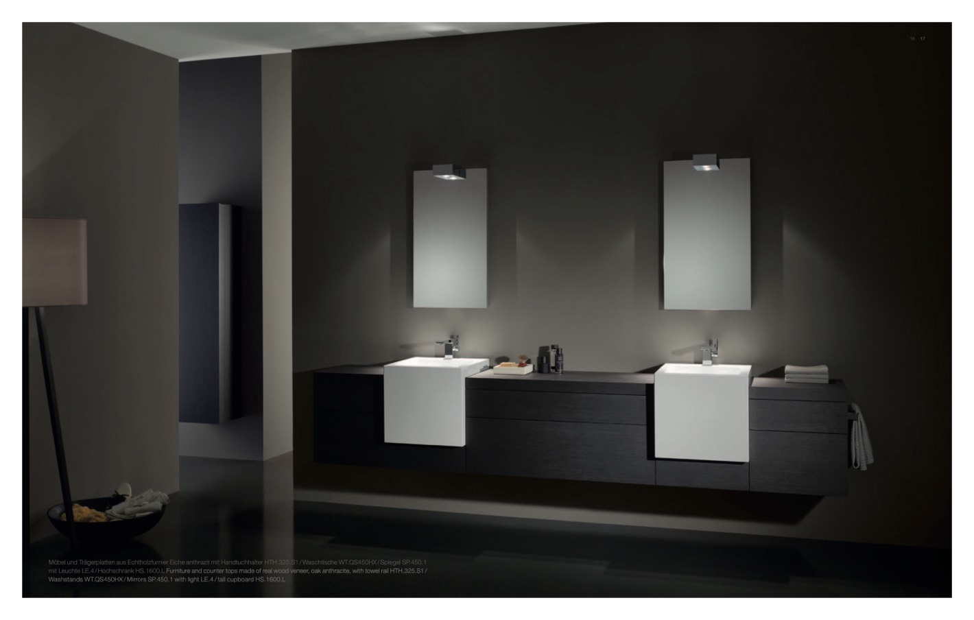 mit Leuchte LE.4 / Hochschrank HS.1600.L Furniture and counter tops made of real wood veneer, oak anthracite, with towel rail HTH.325.S1 /
