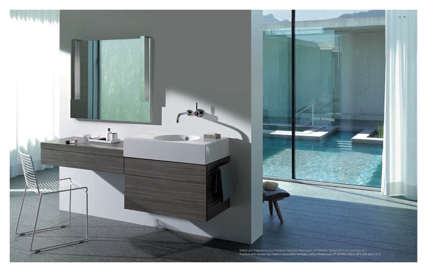 Furniture and counter top made of wood effect laminate, walnut / Washstand WT.MC800 / Mirror SP.2 with lights LE.2