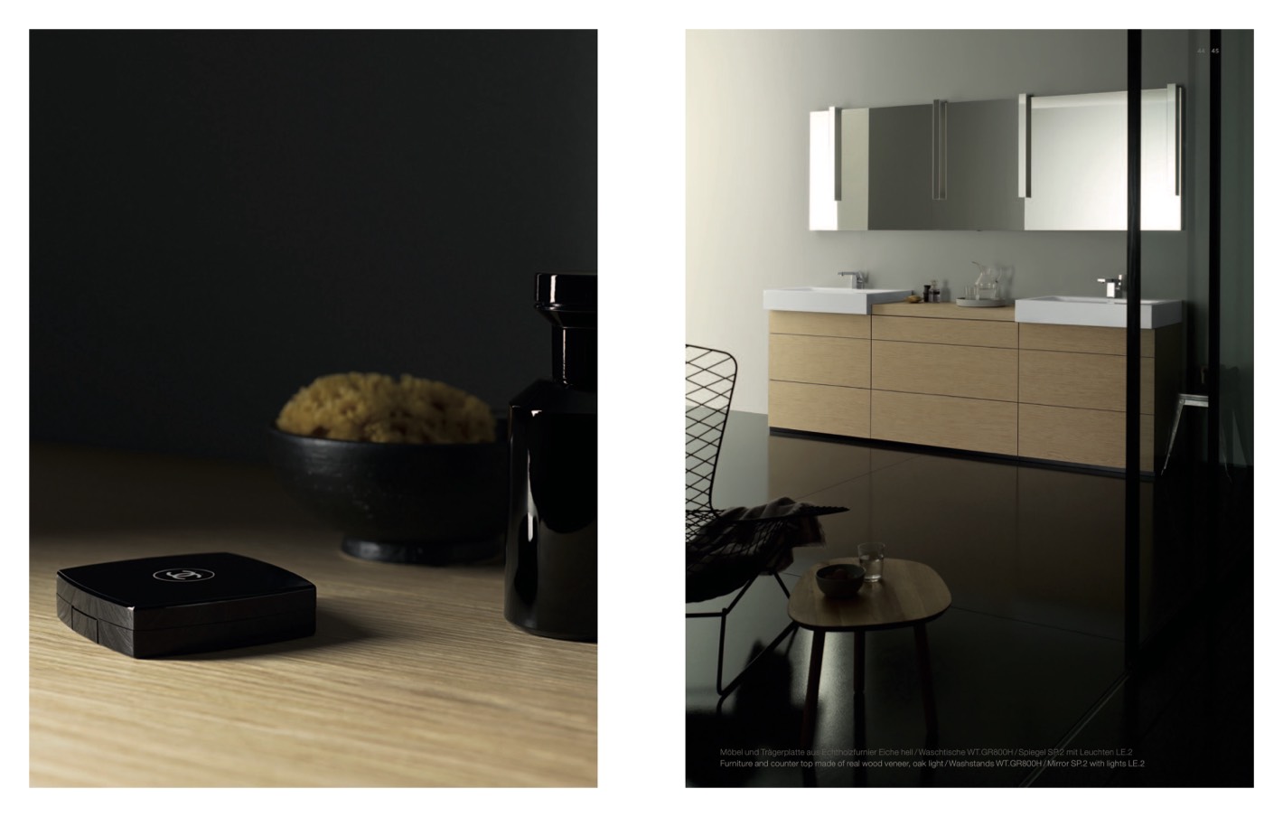 Möbel und Trägerplatte aus Echtholzfurnier Eiche hell / Waschtische WT.GR800H / Spiegel SP.2 mit Leuchten LE.2