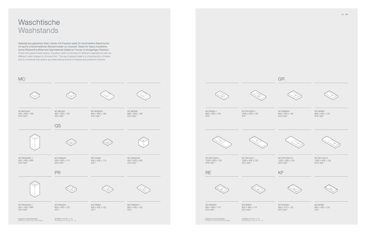 Fitted with glazed steel basins, A ̆system addit comprises 24 different washstands with six