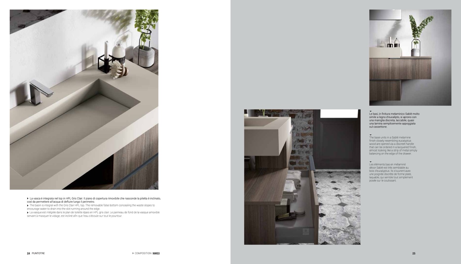 The basin is integral with the Gris Clair HPL top. The removable false bottom concealing the waste slopes to