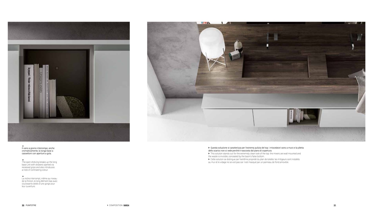 Questa soluzione si caratterizza per l’estrema pulizia del top: i miscelatori sono a muro e la piletta