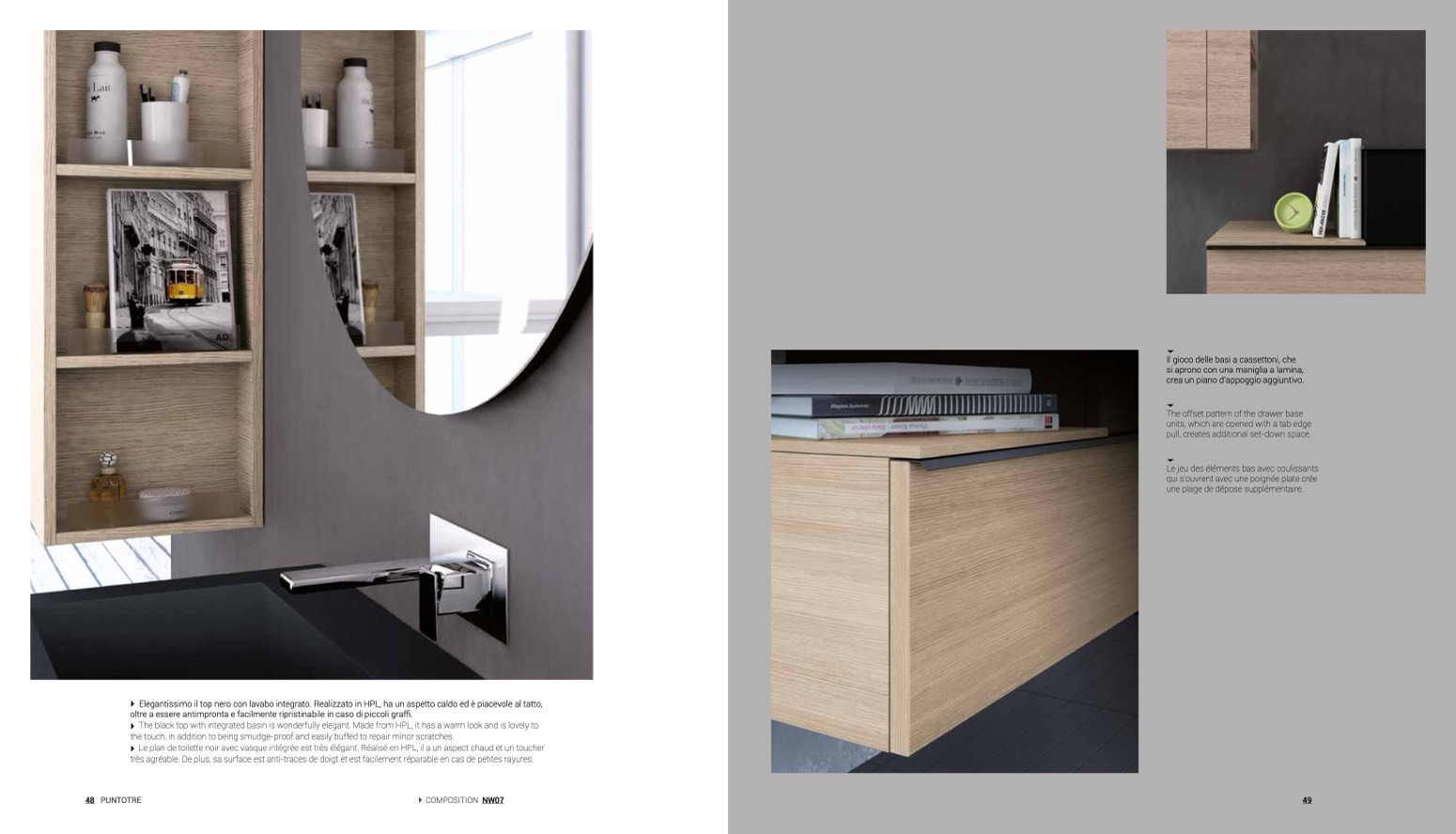 Elegantissimo il top nero con lavabo integrato. Realizzato in HPL, ha un aspetto caldo ed è piacevole al tatto,