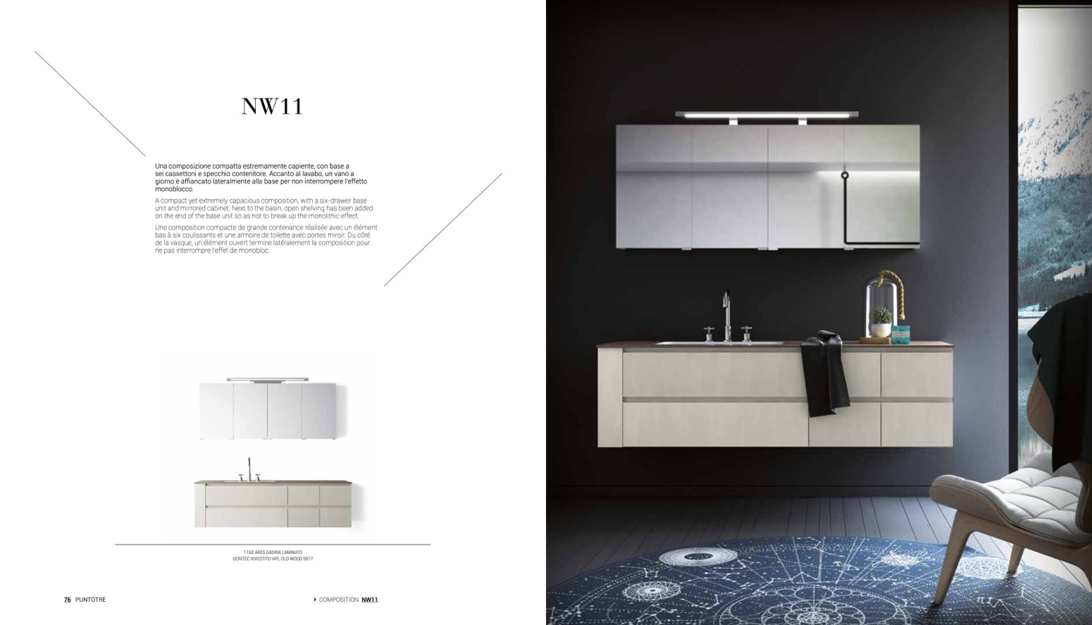 sei cassettoni e specchio contenitore. Accanto al lavabo, un vano a