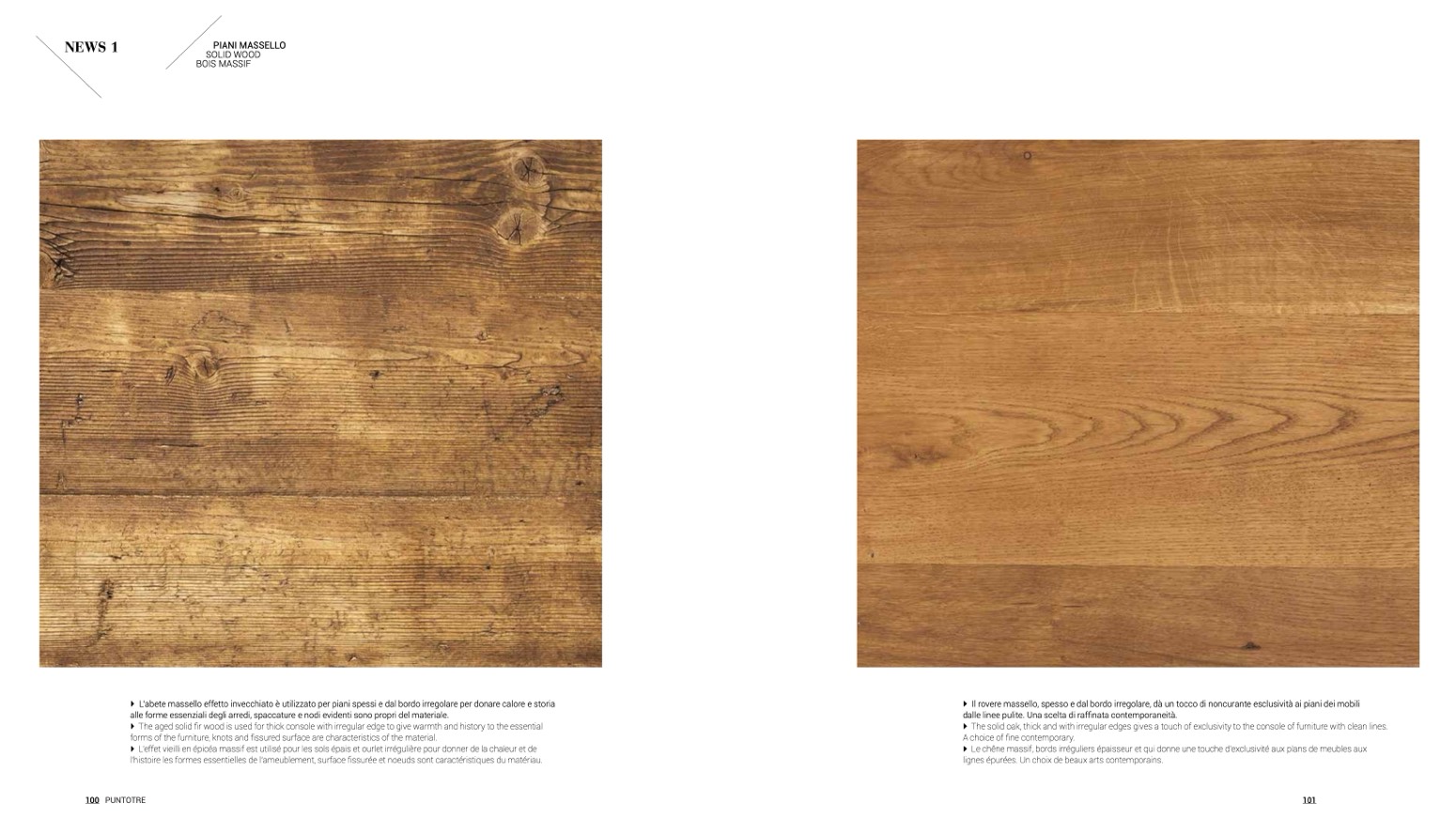 L’abete massello effetto invecchiato è utilizzato per piani spessi e dal bordo irregolare per donare calore e storia