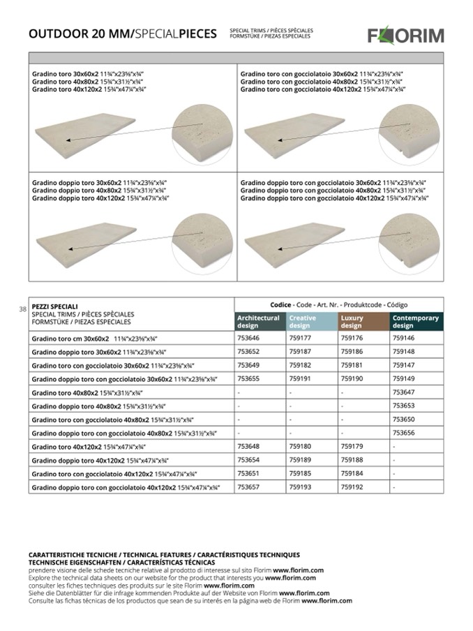 Siehe die Datenblätter für die infrage kommenden Produkte auf der Website von Florim www.
