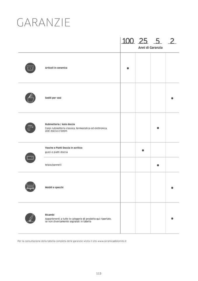 Per la consultazione della tabella completa delle garanzie visita il sito www.ceramicadolomite.it