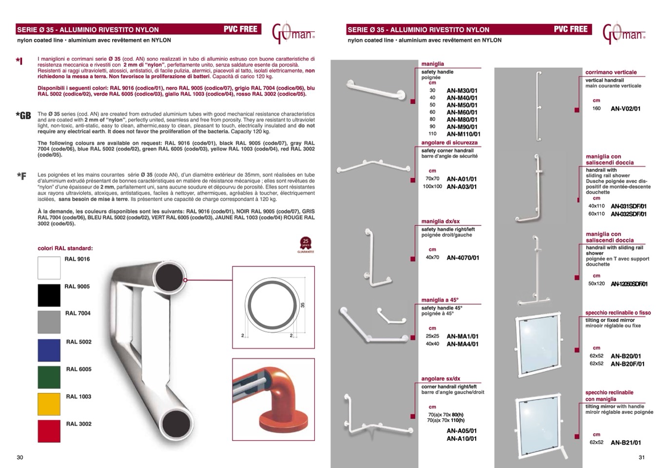 I maniglioni e corrimani serie Ø 35 (cod. AN) sono realizzati in tubo di alluminio estruso con buone caratteristiche di