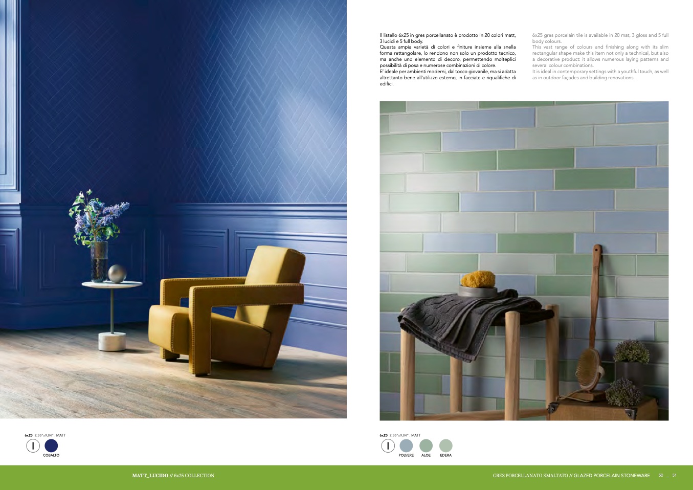 6x25 gres porcelain tile is available in 20 mat, 3 gloss and 5 full