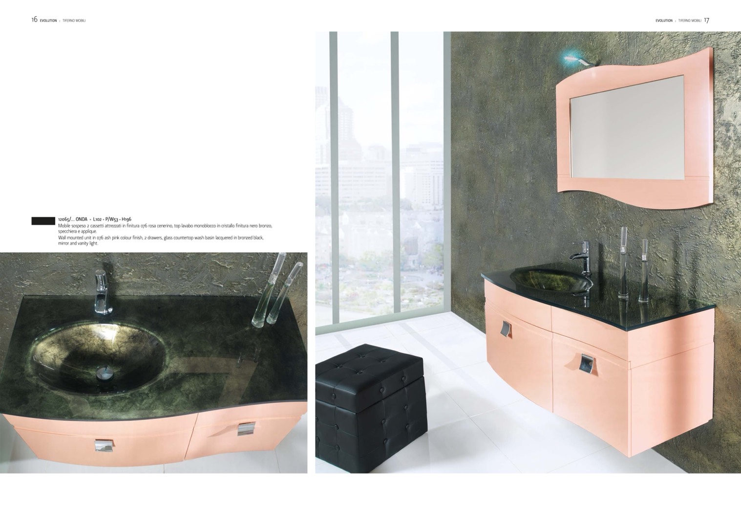 Wall mounted unit in 076 ash pink colour finish, 2 drawers, glass countertop wash basin lacquered in bronzed black,