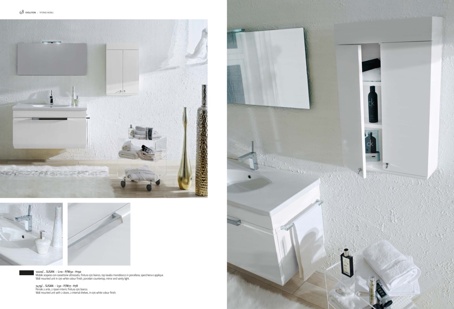 Wall mounted unit in 070 white colour finish, porcelain countertop, mirror and vanity light.
