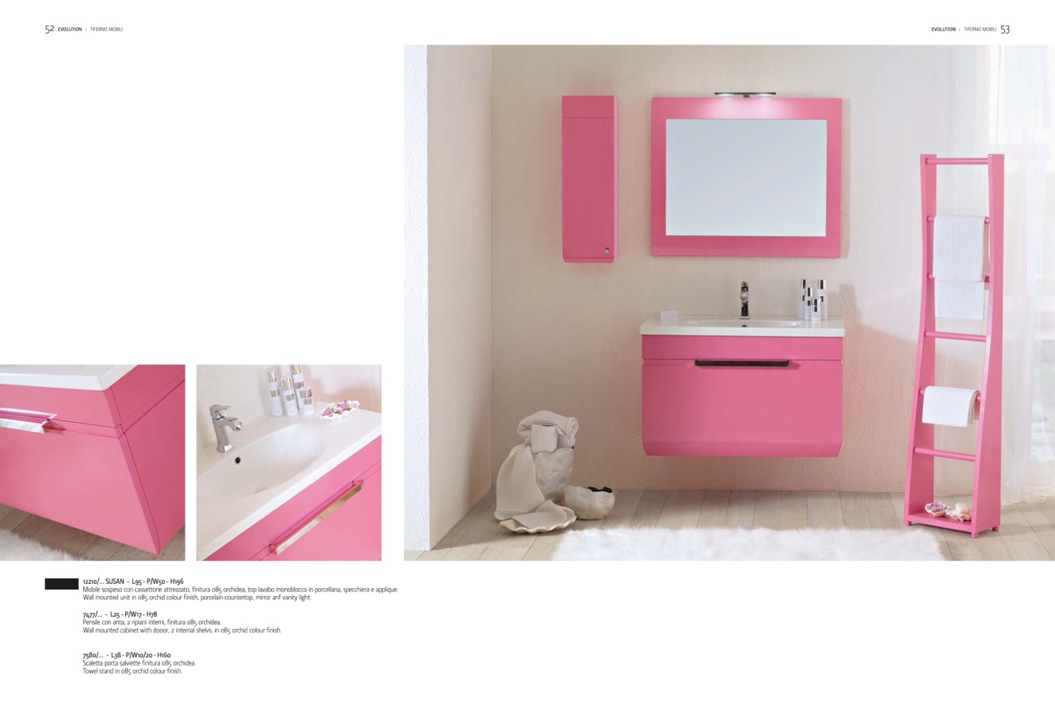 Mobile sospeso con cassettone attrezzato, finitura 085 orchidea, top lavabo monoblocco in porcellana, specchiera e applique.