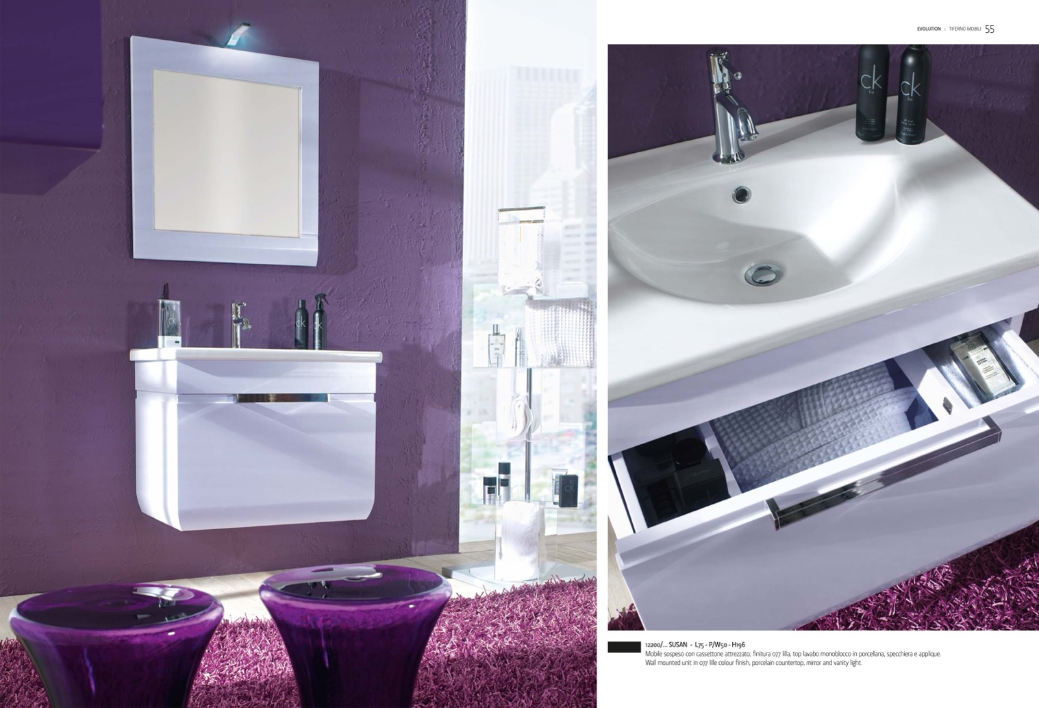 Mobile sospeso con cassettone attrezzato, finitura 077 lilla, top lavabo monoblocco in porcellana, specchiera e applique.