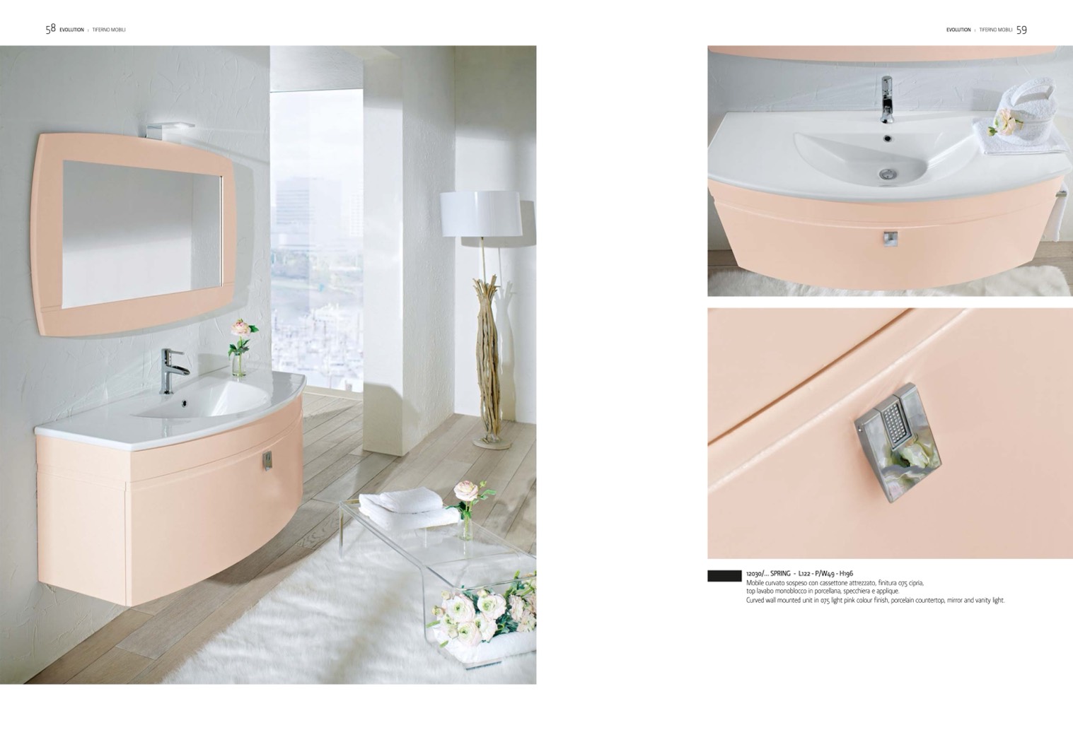 Curved wall mounted unit in 075 light pink colour finish, porcelain countertop, mirror and vanity light.