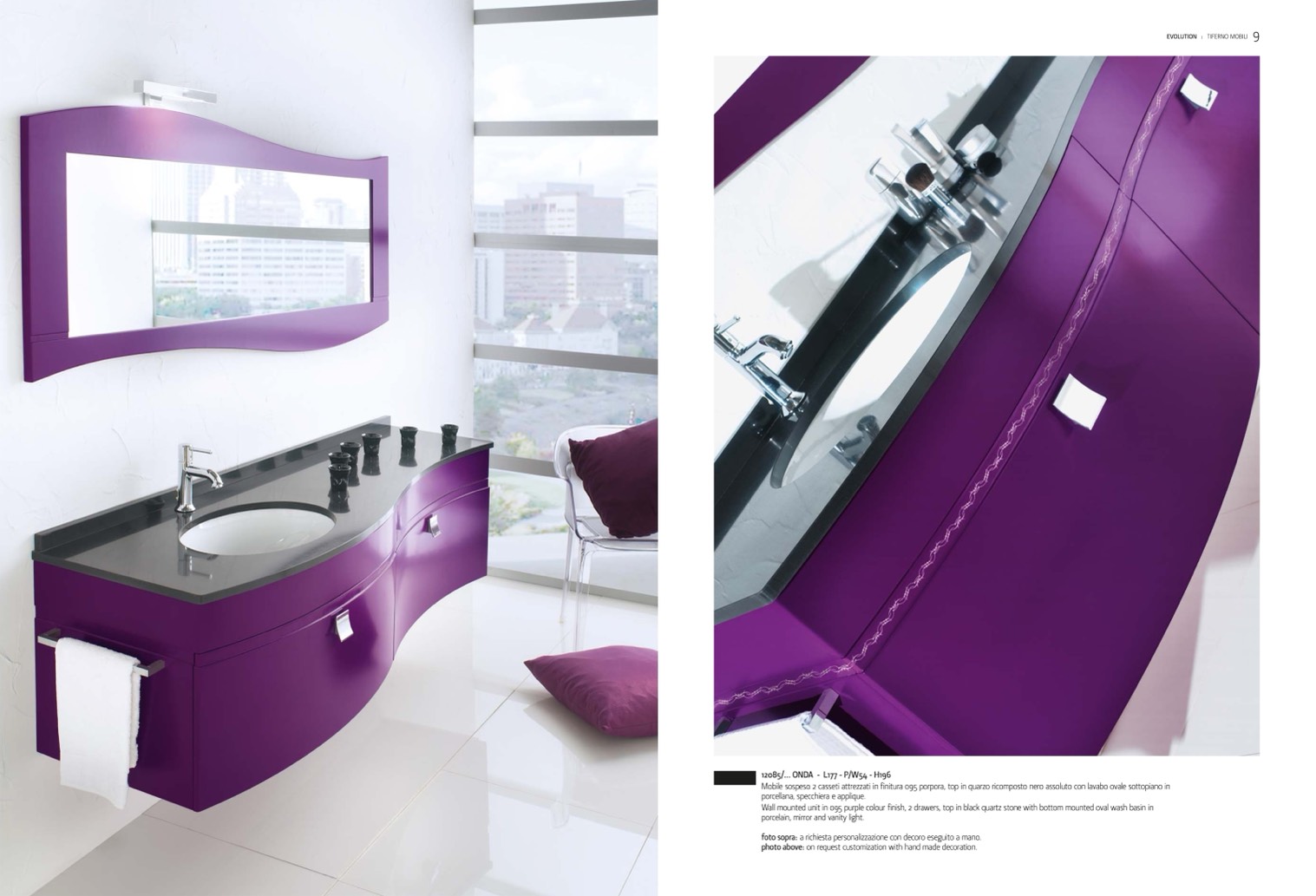 Wall mounted unit in 095 purple colour finish, 2 drawers, top in black quartz stone with bottom mounted oval wash basin in