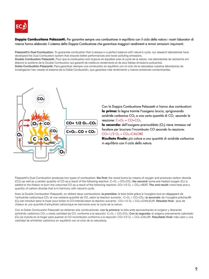 Palazzetti’s Dual Combustion produces two types of combustion: the first: the wood burns by means of oxygen and produces carbon dioxide