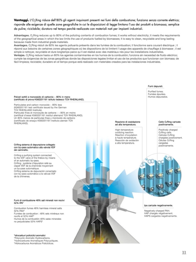 Ring reduces up to 80% of the polluting contents of combustion fumes; it works without electricity; it meets the requirements