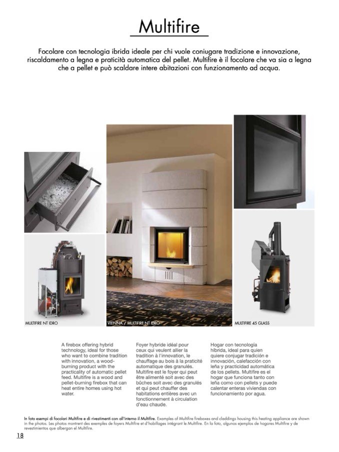 In foto esempi di focolari Multifire e di rivestimenti con all'interno il Multifire. Examples of Multifire fireboxes and claddings housing this heating appliance are shown
