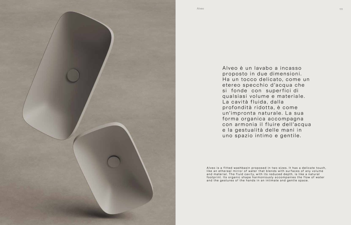 Alveo is a fitted washbasin proposed in two sizes. It has a delicate touch,