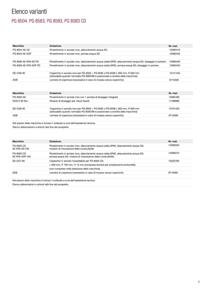 Rivestimento in acciaio inox, allacciamento acqua calda (WW), pompa acqua AD, dosaggio in polvere