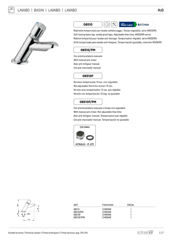 Grifo temporizado para lavabo anti-bloqueo. Temporización ajustable, colección MODERN