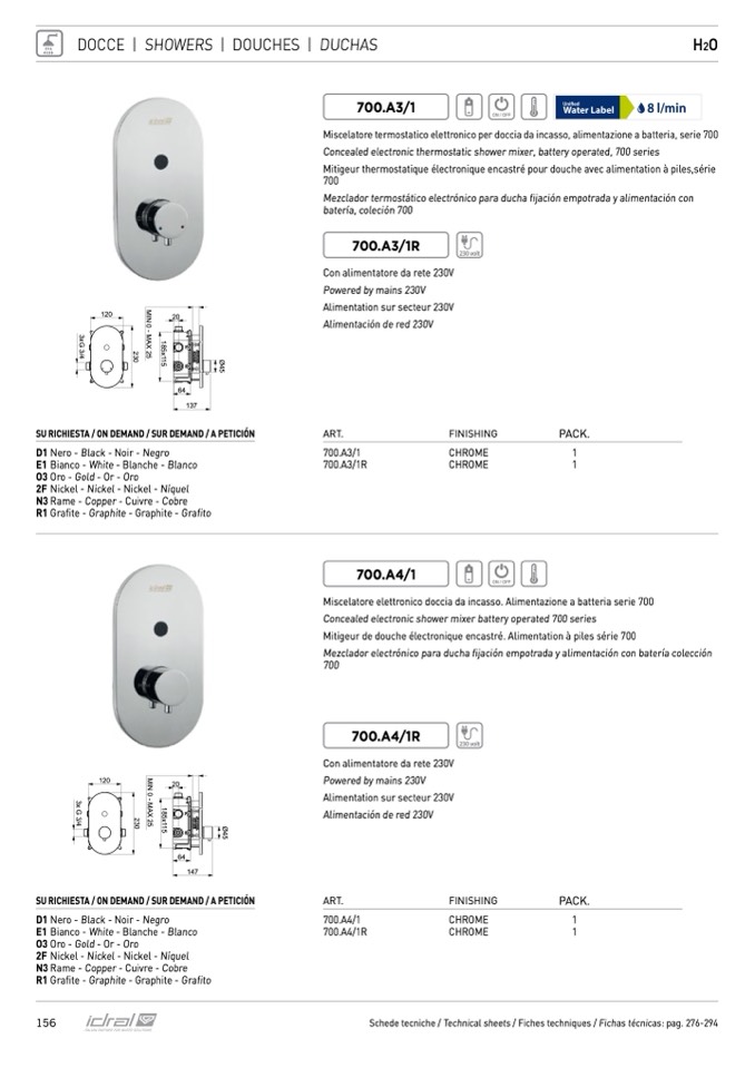 Miscelatore termostatico elettronico per doccia da incasso, alimentazione a batteria, serie 700