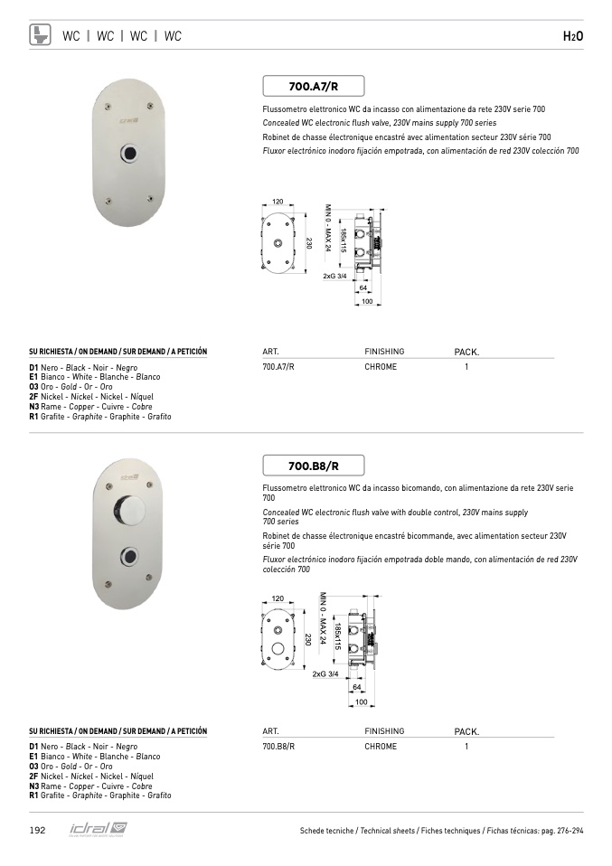 Flussometro elettronico WC da incasso con alimentazione da rete 230V serie 700