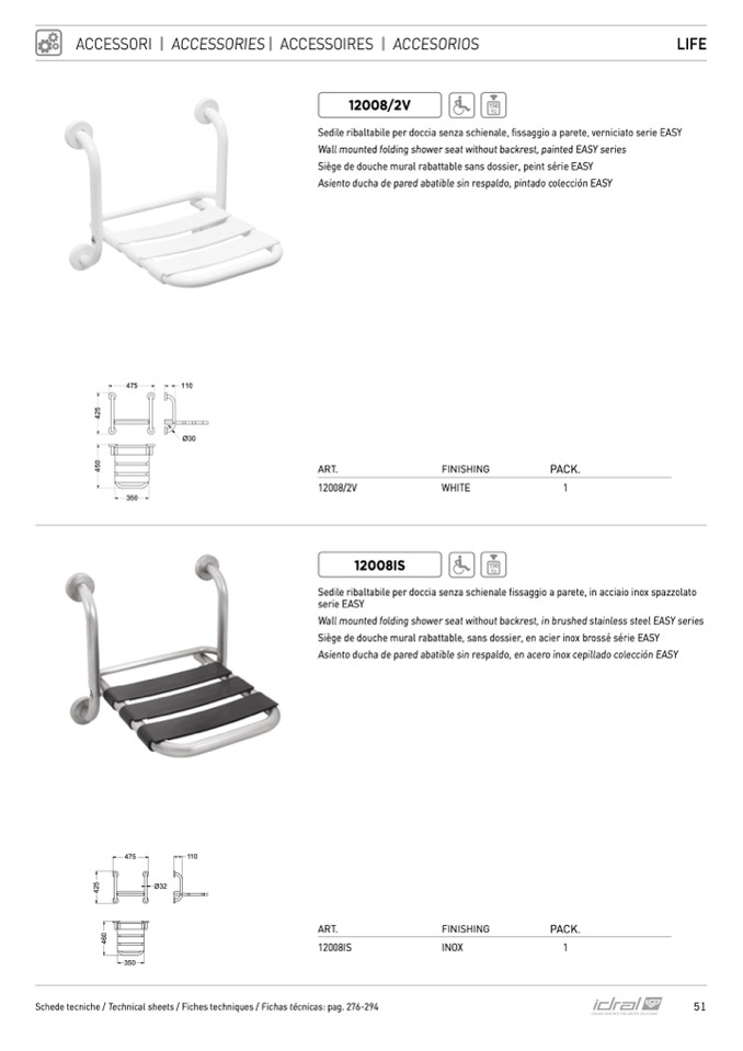 Sedile ribaltabile per doccia senza schienale, fissaggio a parete, verniciato serie EASY